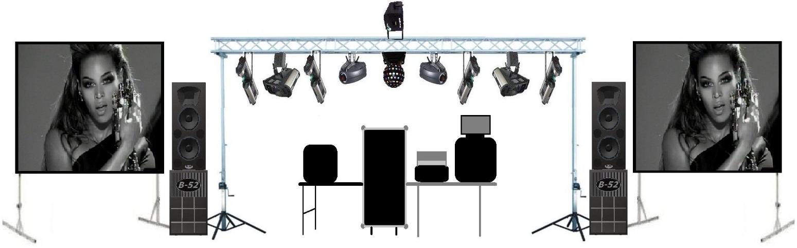 | Minimum set-up space requirements is 15' deep by 25' long. Premium DJ/Video System, Lighting System & 11' Stretch Video Screen |